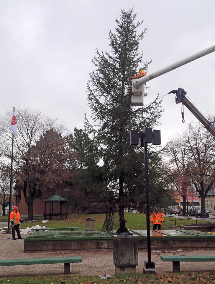 The establishment of the giant Christmas tree at the Justice Building is made possible by the contributions of numerous partners including Strathmore tree farm, the Cornwall Community Police Service, the Downtown Business Improvement Area, City of Cornwall, Black & McDonald and Metro Towing.