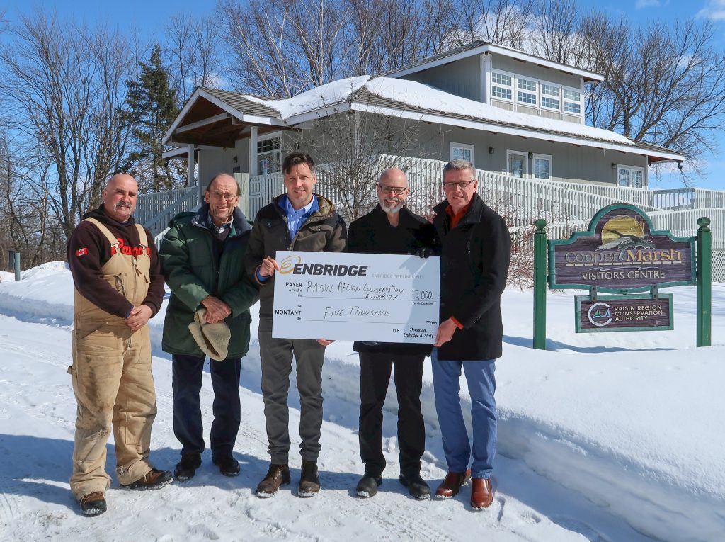 Photo (from left to right): Pete Sabourin, Manager of Field Operations, Raisin Region Conservation Authority; Robin Poole, Chair, Cooper Marsh Conservators; Alek Dupras, Sr. Right of Way Agent, Enbridge; Richard Pilon, General Manager, Raisin Region Conservation Authority; Frank Prevost, Chair, Raisin Region Conservation Authority.