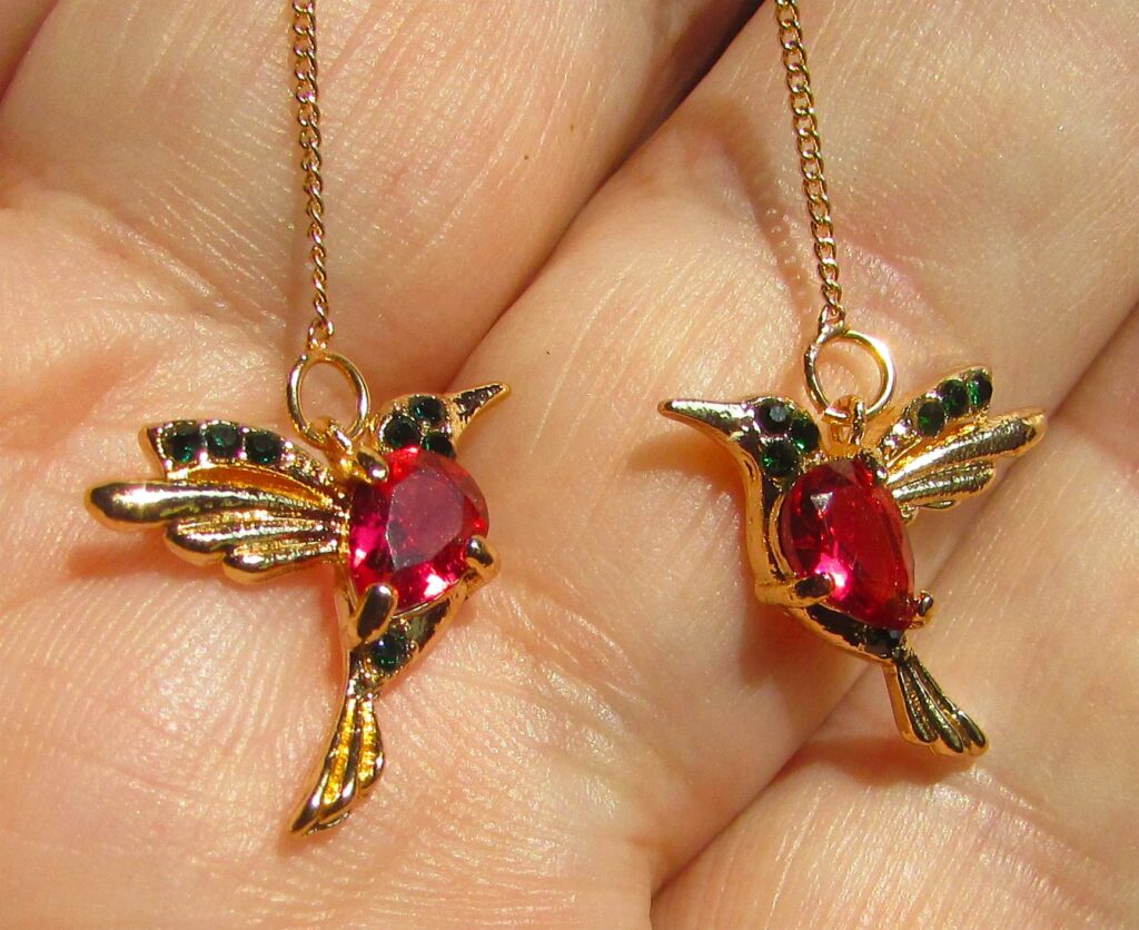 Item of the Month: This month I have chosen an item that is so delicate and oh, so pretty. It isn’t another pair of boots or shoes, but a pair of earrings that Johnny bought for me.. just because. I have always loved the beautifully coloured miniature bird, The Hummingbird. So, Johnny being the sweetheart that he is gave me a pair to wear in my ears. Thank you my love. I love them and I will wear them with a smile from earring to earring.