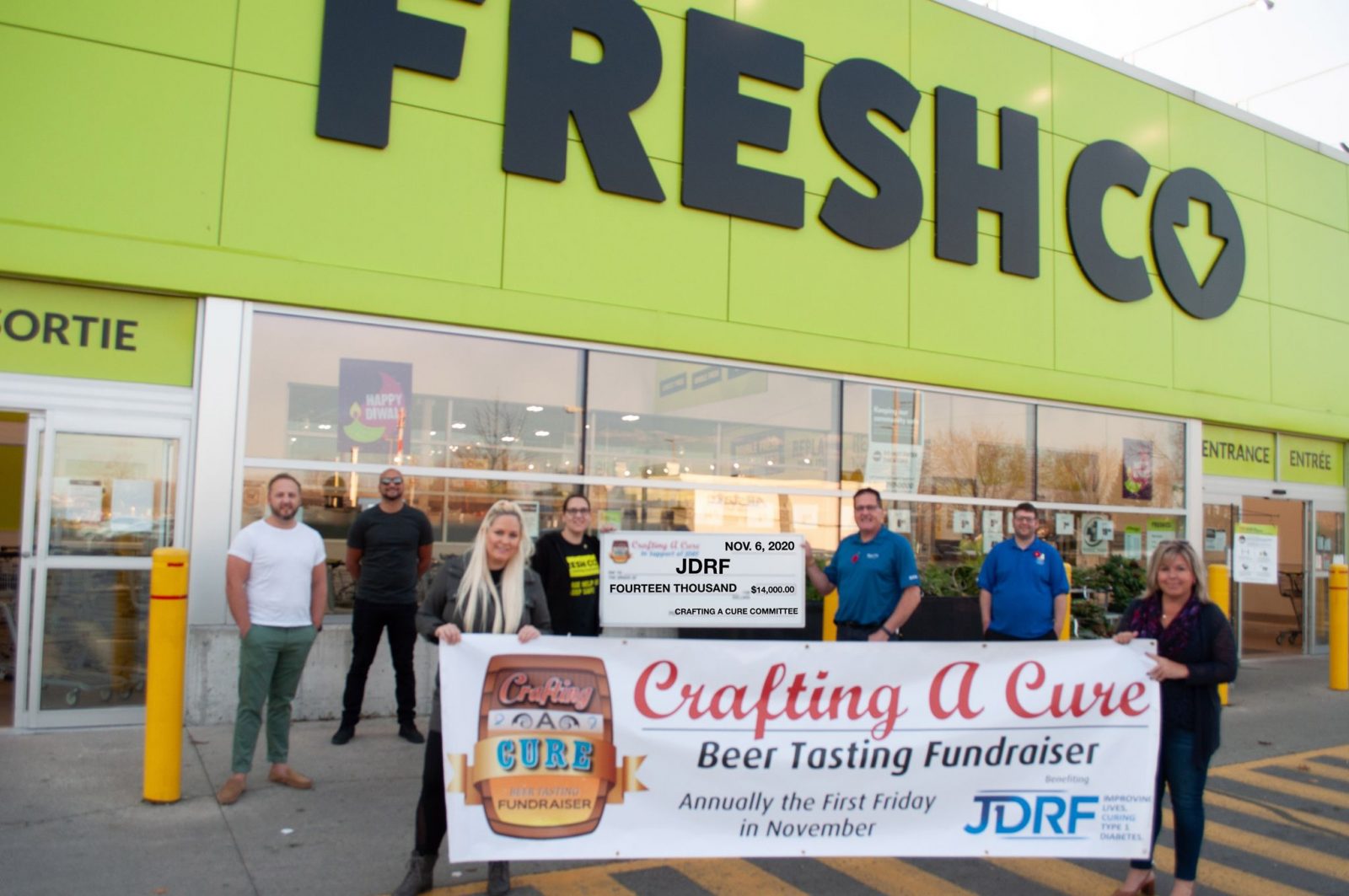 The 2020 Crafting A Cure Committee with a $14,000 cheque to JDRF From L-R: Patrick Larose, Shannon Ferguson, Matthew Girgis, Jordan O’Brien, Chair Bill Makinson, Gabriel Riviere-Reid, and Tanya Flaro .