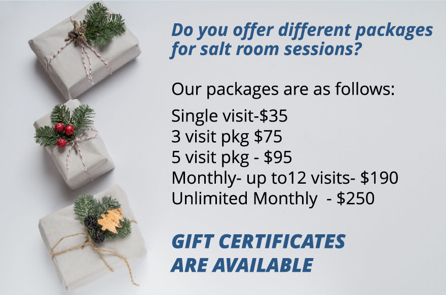 This year more than ever we are focused on our health. We are also acutely aware that our seniors need to be protected more than ever. Why not stop by and pick up a Gift Certificate for Salt Therapy as a stocking stuffer for the older people in the family? Studies have shown Halotherapy works as a respiratory cleanse and to strengthen the immune system. It makes sense to take extra care at this time. Considering we are into flu season and Covid is still out there and not showing any signs of letting up. We are spending even more time than usual locked up in our homes. When we do go out we’re wearing a mask and rebreathing much of our own CO2, which is very unhealthy.