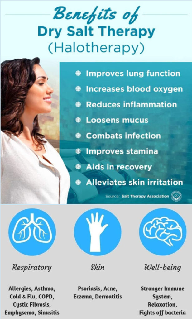 You may be asking yourself how Halotherapy can help? During a session in the Salt Room you relax in a low light environment sitting in a zero gravity chair and inhale micronized pharmaceutical salt particles deep into the lungs. How can salt help our breathing? Salt is known as an anti-inflammatory, antifungal, antibacterial, super absorbent and crystalline in form. Research has shown that when inhaled, it clears and loosens up mucus and kills pathogens. This is why our breathing is improved after a session.