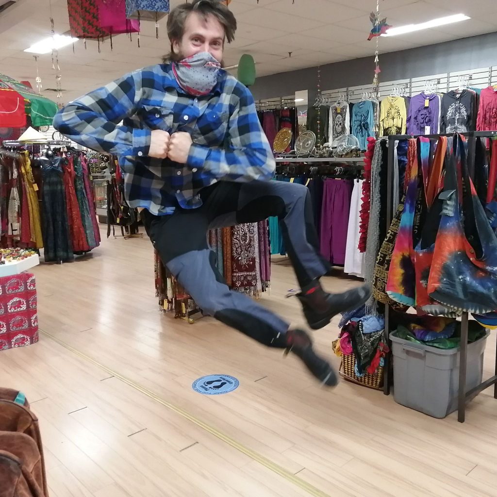 Everywhere you look you will discover so many gems and one gem that I did discover today was owner, Derek Morley. Talk about a unique character – a poet, a Polar Bear Swimmer, Acrobat (as you can see by the photo) and comedian plus an individual who is supporting so many artists and artisans throughout his store.