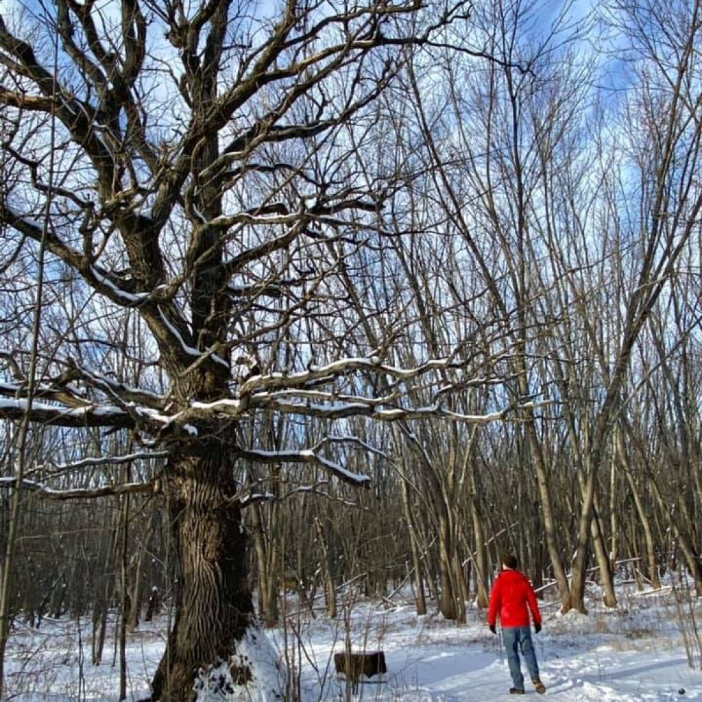 This forest is known for its biodiversity and as you walk along the trail you can almost see the invisible lines separating the different ecosystems. It is like opening a door to a new room. Dramatically, the main corridor through the silver maples opens up to reveal a massive bicentennial bur oak. It commands respect, almost glowing with its authority. What a fitting place for a junction which starts the beginning of the loop. As the trail winds around the oak we see from its branches a whimsical bird feeder in the shape of a wishing well, the first of many beautifully crafted feeders in the forest, which include such styles as a covered sleigh and a log-cabin. They look like recent additions to the forest.