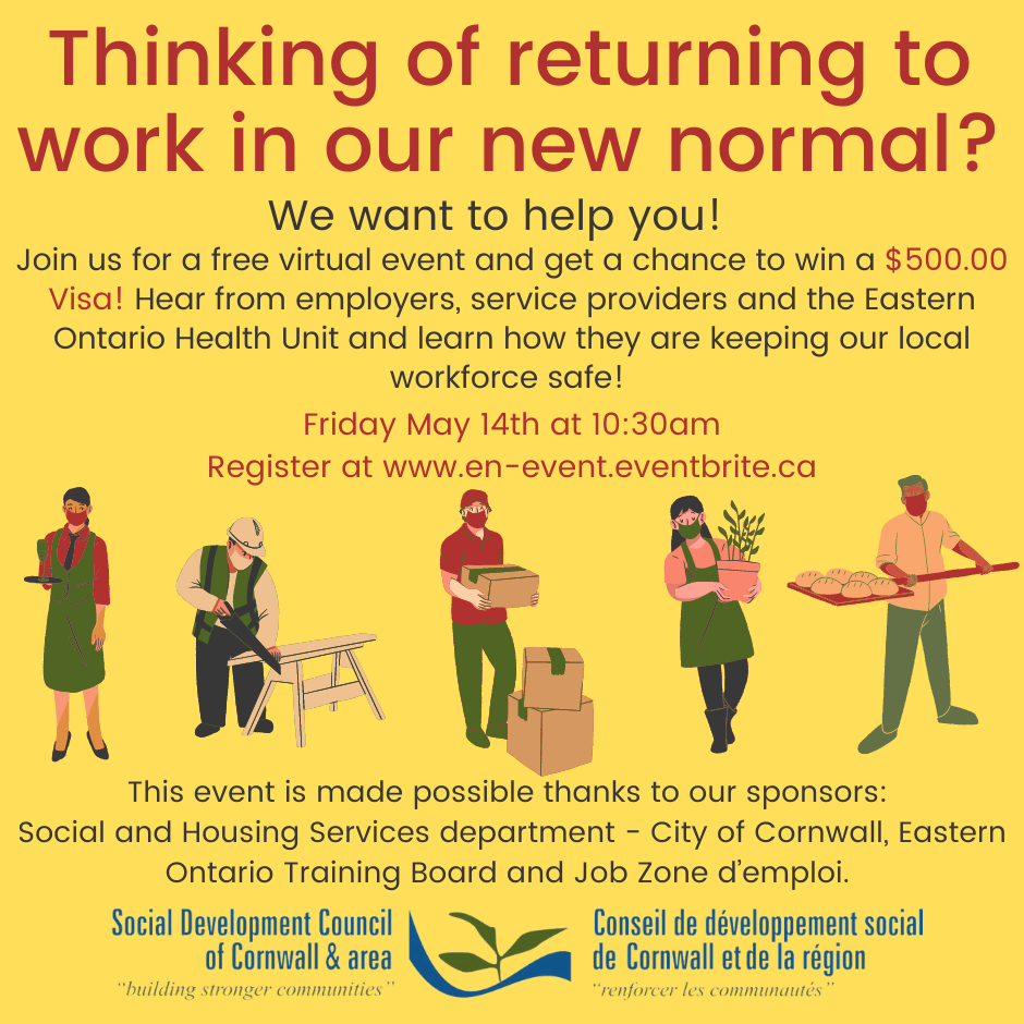 Join the Employability Network of the Social Development Council of Cornwall and Area and its partners as they prepare you to return to work in our new normal. You will have the opportunity to join a virtual session in french or in english to learn about how our local service providers can help you re-enter the workforce. “Local Employment Service Providers are available to help support job seekers secure employment and assist in maintaining employment during and after the pandemic. Job Zone d’emploi is pleased to be working with these local service providers to support the Social Development Council’s virtual event.” Kim Arbic, Director of Community Relations at Job Zone d’emploi.