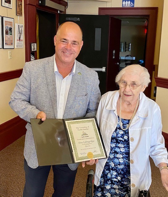 The Township of North Dundas presented Elva with a certificate and pink roses in recognition of her 94th birthday.