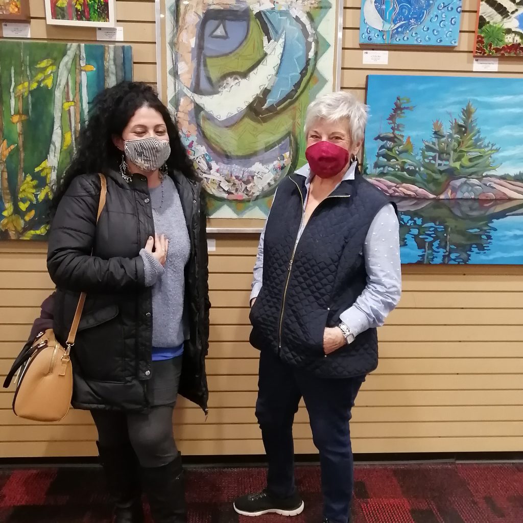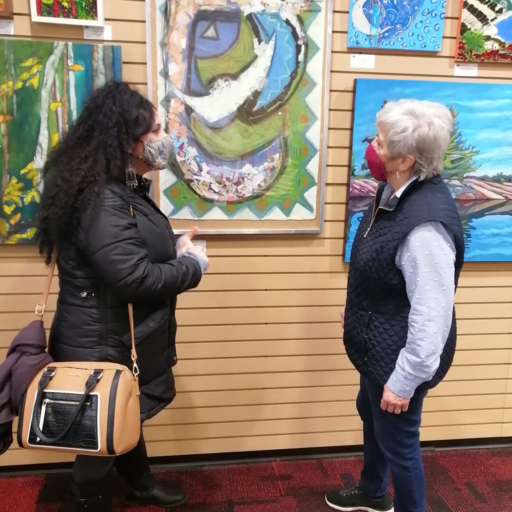 I introduced her to the President of Focus Art, Claudine Trottier and also Rose Desnoyers, the Secretary. Rose posed for me by one of her paintings. Also at the show was artist Yafa Goawily who came to Cornwall a year and a half ago (at the start of the Pandemic) but has certainly made a home for herself in the Cornwall Art Community. I got a great shot of Yafa explaining one of her paintings to Rose.