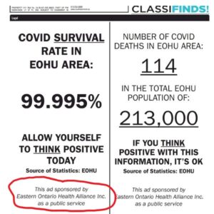 In October 2021, paid-for anti-vaccine/ anti-mask ads began to appear in the Standard-Freeholder from the EOHAlliance Incorporated as a public service. This was before the EOHA was a registered corporation and before it had a website.