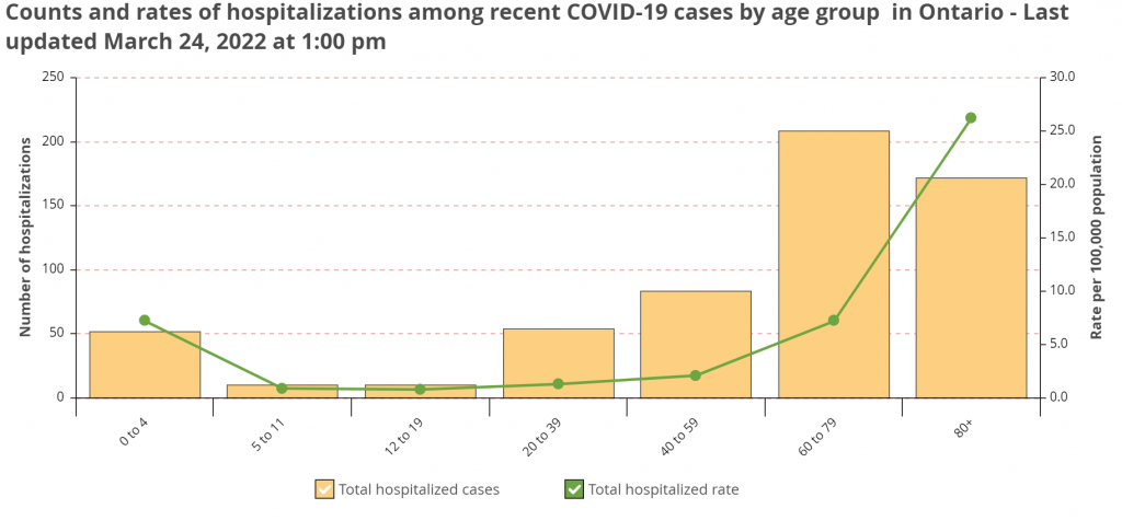 On March 24 when I was researching for these articles, the above graph shows the counts of Ontario children in hospital by age was: age: 0-4 = 52, age: 5-11 = 10, age:12-19 = 10 making a total that day of 72 Ontario kids in the hospital. That’s not nothing – especially when that’s your child.