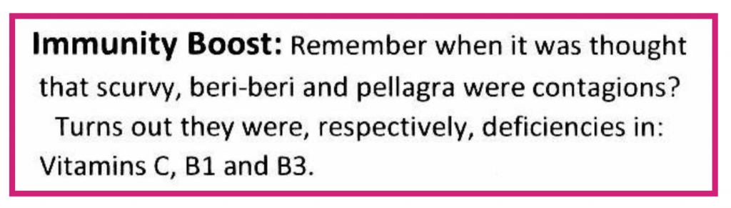 No, I don’t “remember”. I wasn’t born then and neither was Mr. Gatien. It was proven that scurvy could be successfully treated with citrus fruit in 1753. In 1911, a British scientist, Casimir Funk, crystallized a rice husk-derived substance that cured beriberi and Joseph Goldberger started studies in 1914 that led to the discovery that pellagra was caused by a deficiency of the B vitamin niacin (nicotinic acid). Comparing 100-year-old science to today’s science is nuts. Comparing vitamin deficiencies to viruses is also nuts.