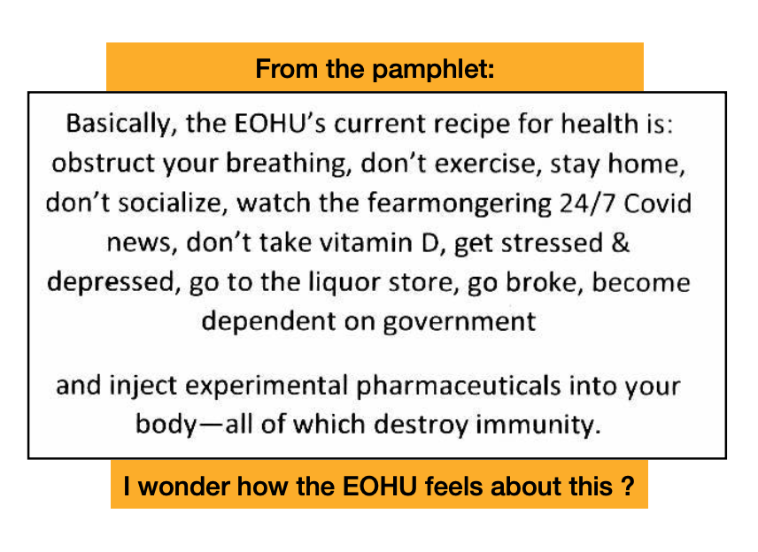 This is a 3 part series of articles about the EOHA and their anti-mask/anti-vaccine crusade as expressed mostly through their new pamphlet campaign. In case you did not read part 2 you can find it here. While I did a lot of “googling” on my own, I was very lucky to have the support and guidance of two very generous medical researchers: Dr. Richard Bazinet and Dr. Tara Moriarty who each have research labs at the University of Toronto.