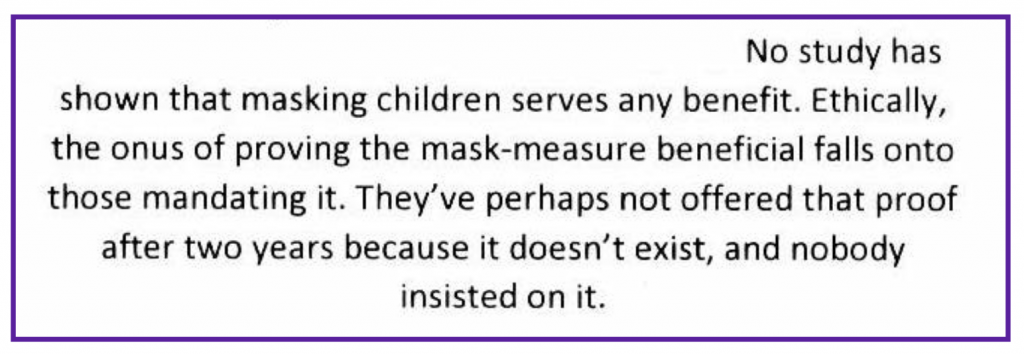 Dr. Bazinet pointed out to me that studies are lacking because you can’t ethically force people to be part of the unprotected control group in a pandemic. So, is the EOHA suggesting that we should have deliberately maintained a control group of purposely unmasked children? And what about the ethical issues of transmitting a serious and sometimes deadly disease to others?