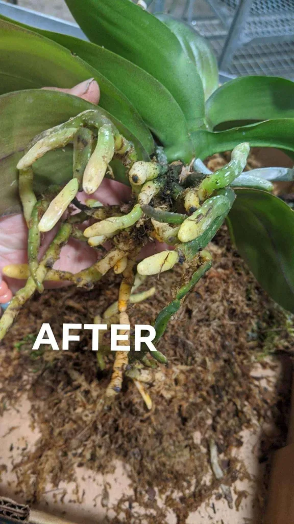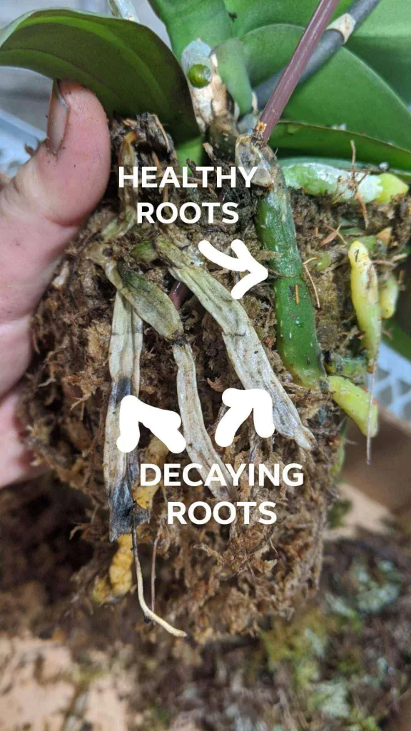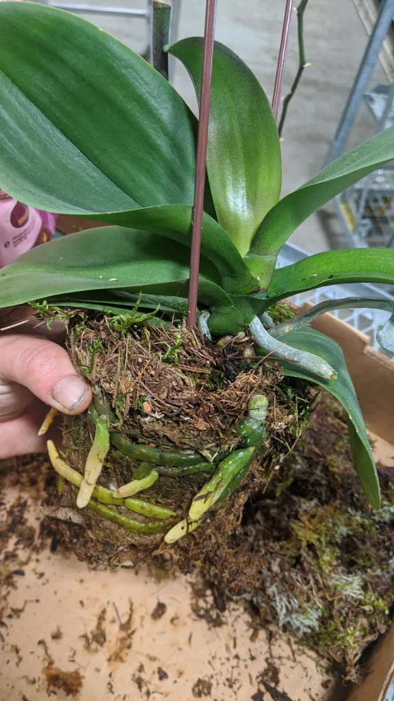 The first thing you want to do is soak the roots so that they are back to a nice green and easy to move around, this is to avoid breaking them. Slowly remove the orchid and remove the drenched moss from the plant so you can see if any dead or decaying roots need to be removed. When looking for a growing medium for orchids, it should be a bark-like coarse substrate. Orchids are epiphytes so they need to have airflow where they grow and they are not sitting in water but they do need some humidity.