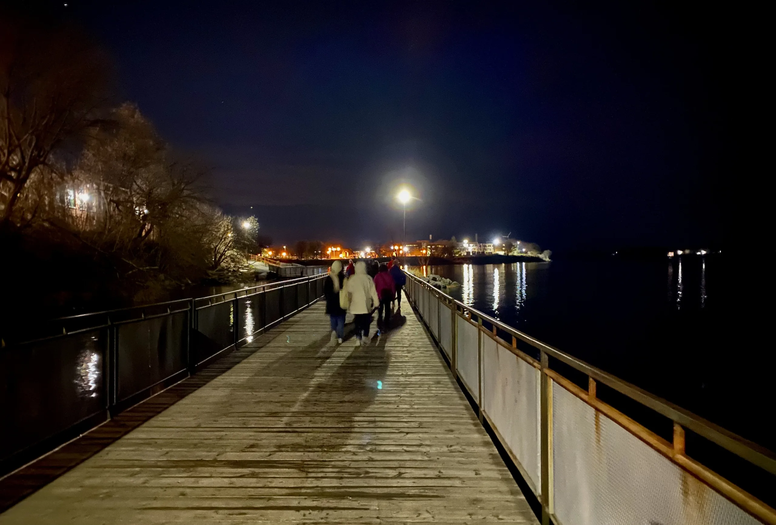 I kill the lights and turn off the ignition. For a November evening, the parking lot is bustling, in part because we have chosen the boat launch parking lot as a meeting spot for our group’s outing. We have chosen to take advantage of the recently enhanced lighting around Lamoureux Park’s paths for a pre-dinner promenade. There is nothing like a brisk walk to whet one’s appetite.
