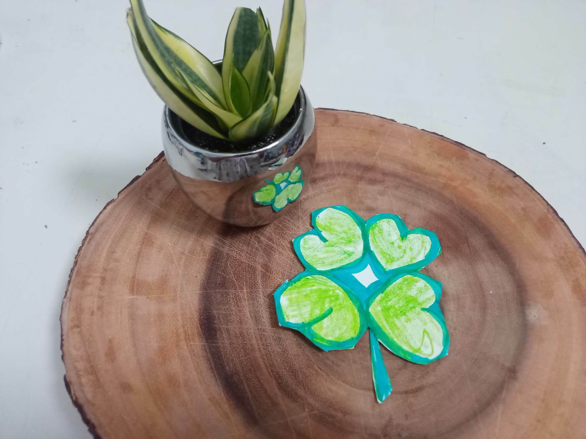 We can also use reusable paper plates. Draw four connected hearts. Cut out the shape and colour it Green.