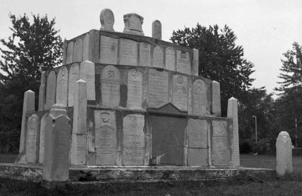 Photo: The composite monument built in 1932, with many of the historic gravestones from St. John’s Presbyterian Church’s cemetery. Demolished in 2017. (Photo courtesy,“Standard-Freeholder.)