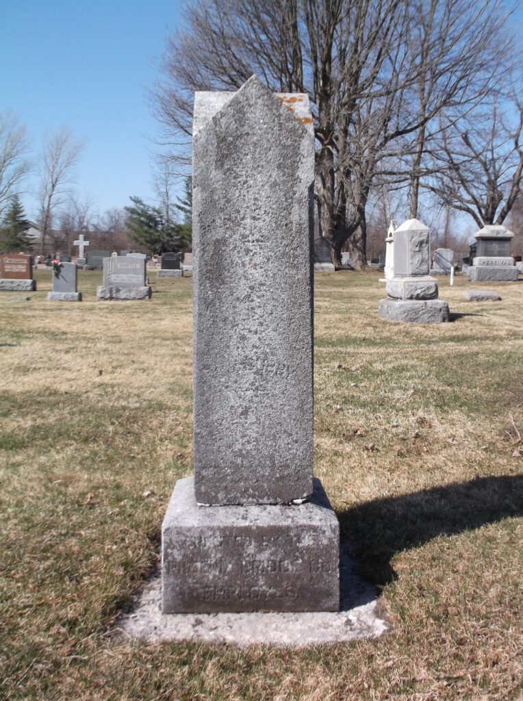 PHOTO: The tombstone for four of the of the 15 men killed in the September 6th, 1898 bridge collapse, in Woodlawn Cemetery, in section 85, just left of the Ross/Empey stone. The eleven other victims were buried in St. Columban’s Cemetery. With the names all but obliterated you can just see the letters “…ubby” for W.J. Cubby and read the comment on the stone’s base which I believe reads:“Dedicated by the Phoenix Bridge Co. Employees.”The only letter I could read on the back of the stone was “s” for either Wm. Saunders or Wm. Sherman. Ramond Dysart’s name has been completely eroded.