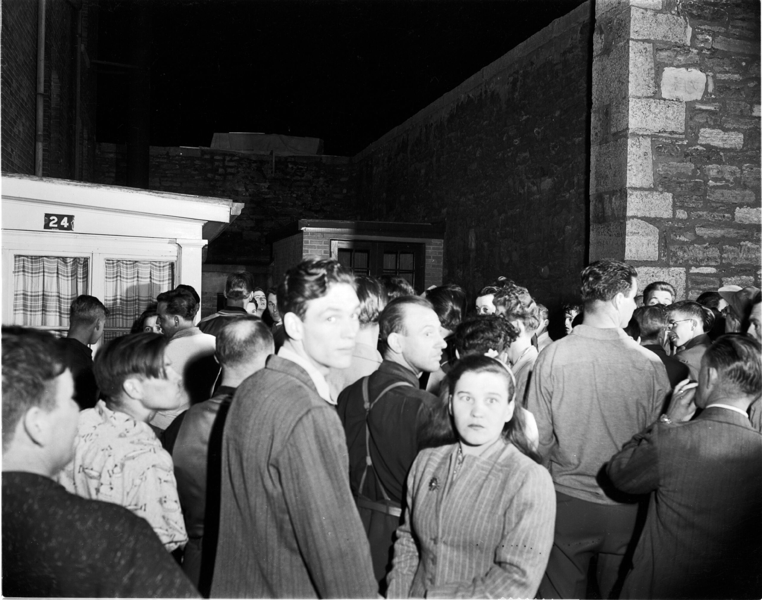 PHOTO: This disturbing image taken by veteran “Standard-Freeholder,” Marcel Quenneville depicts the “Morbid Mob,” excitedly waiting to hear the scaffold drop outside of the Cornwall Jail’s walls announcing the death of convicted murderer Peter Balcombe.