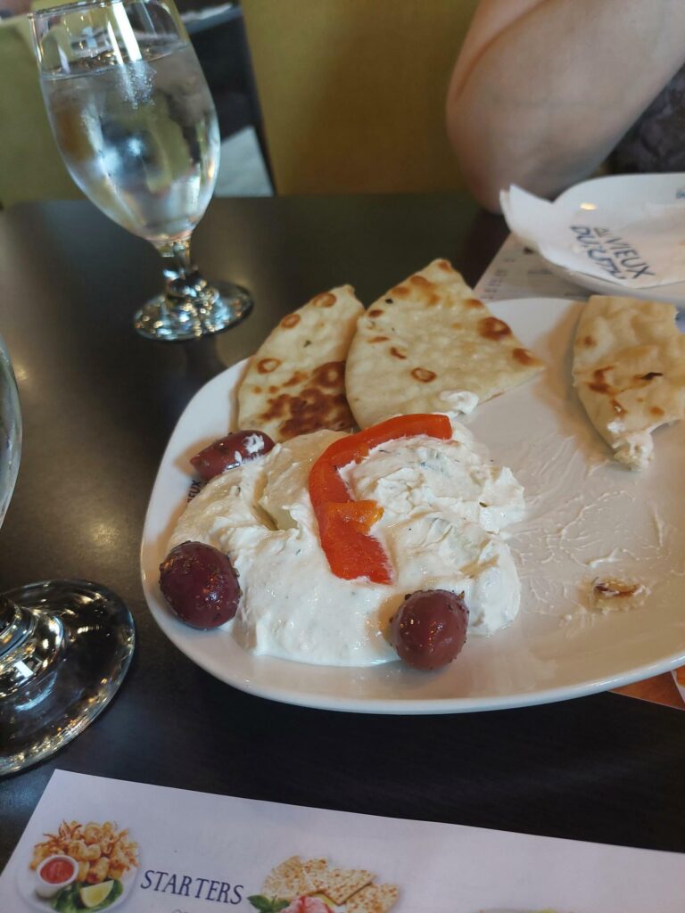 I can hear the lady and the guy working the bar. Something about a complaint and how he’s not calling them back. Joanna returns with our drinks and we start with a round of Pita Bread and Tzatziki Sauce. The sauce was subtle but flavorful and we ate the whole plate. We begin our normal meal small talk about our days. She’s so sweet. She always tells me about the stuff she wants to buy at her work before she makes her purchase. I guess it’s difficult watching other women shop all day maybe? I’ve heard of women synchronizing all kinds of weird things, but shopping? I tried a sip of her drink and it had a faint taste of Kaluaha and 0 vodka. That was mostly milk. Disappointing.