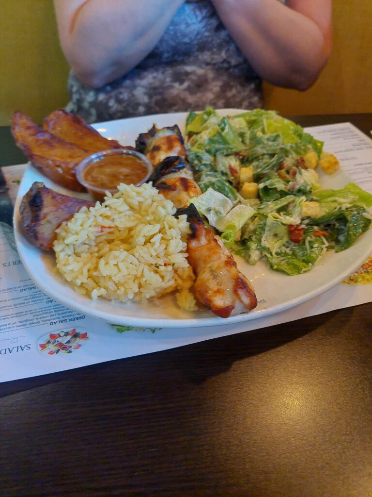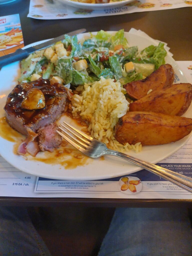 Next up our wonderful waitress brought us our main course. The wife ordered the Chicken Brochette. Came with rice, potato wedges, a pepper sauce and she upgraded to a Cesar salad. I had the Filet Mignon (Duluth Style) with a wine sauce drizzled on the steak, plus all the same accoutrement as my lady minus the pepper sauce. After I took my first bite and sat back in my chair to savor the wonderful medium-rare goodness. I thought to myself: I get it now. The wine sauce tastes like someone stole their grandmas recipe and she studied to be a Saucier in France for 80 years. The word exquisite doesn’t do it justice. The rice was a long grain cooked to perfection and the salad while again subtle, suited the meal. I will say I wasn’t much a fan of the wedges. My wife says I’m wrong in typical wife fashion. She loved them.