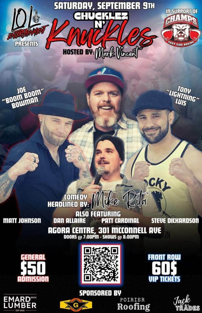 The event on September 9 will be a blend of comedy and boxing. Never before have you seen the two come together for one night. So, I’m happy I can be a part of this history-making event. We will have world class comics doing their stand-up in the ring and the show will culminate with Joe Bowman vs myself in a 3 round exhibition boxing match. Headgear and sparring gloves. A portion of the proceeds raised will be donated to “the little gym that could”, non-profit Champs Eastside Boxing Club. My home away from home. Tickets will go on sale July 1. Tickets will be available at Max’s Pawn Shop (500 Montreal Road) or online at www.LoLEntertainment.ca