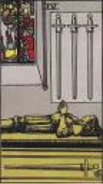 The Four of Swords shows a knight lying horizontally on a tomb. He remains in his full armour, and his hands are in the position of prayer as a sign of rest.
