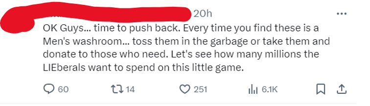 We could start with Ms Ferreri herself. With a roughly $194,600 sessional salary, plus many expenses, Ms. Ferreri’s tampon tantrums seem like a real waste of our tax dollars.