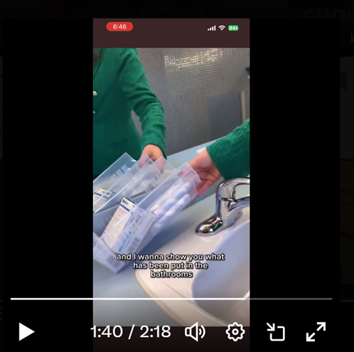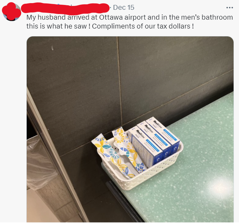 With a camera person in tow, Michelle waltzed into the men’s washroom near her office in a Parliament building to illustrate a potentially wasteful use of OUR taxes. The extravagance in question was a small basket of tampons & pads (3-4 of each) left near the sink.