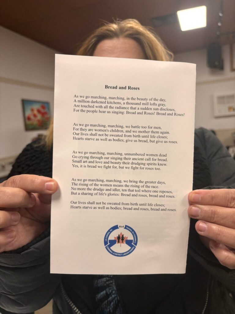 In an unexpected turn, guest speaker Kim Kent from the Canadian Labour Congress stepped in for the originally scheduled speaker. Kent paid homage to the organizers’ advocacy work, emphasizing, “I have so much respect for the sisters in this community and the work they do advocating for workers and families in Cornwall and Area, the organizers of this event do a lot of work in the community to ensure that healthcare is not privatized, they work with the women in Akwesasne and donate money to the shelter there… I’m inspired by their work so I wanted to come and show my support tonight.”