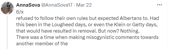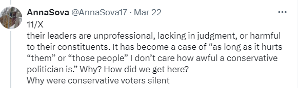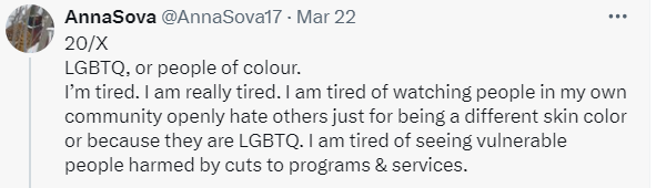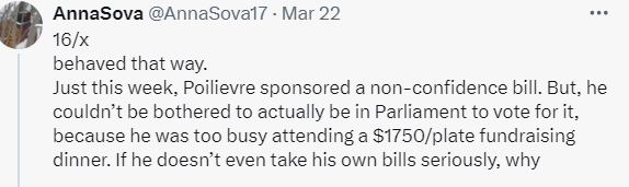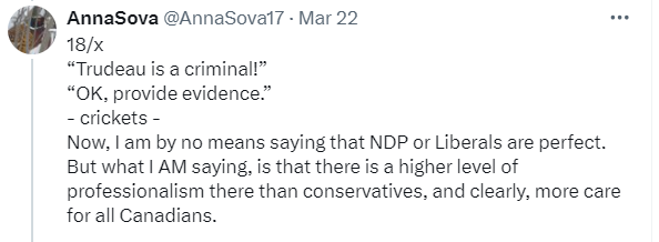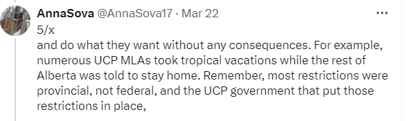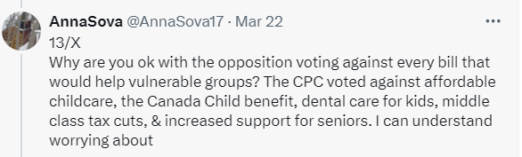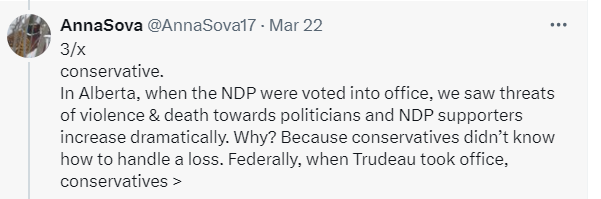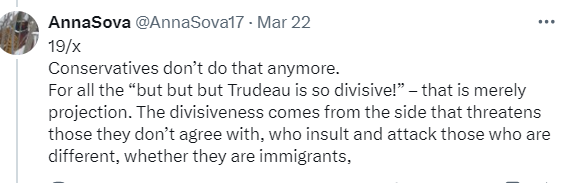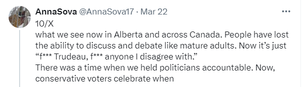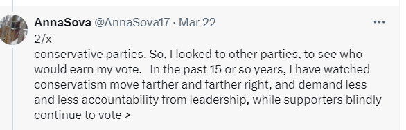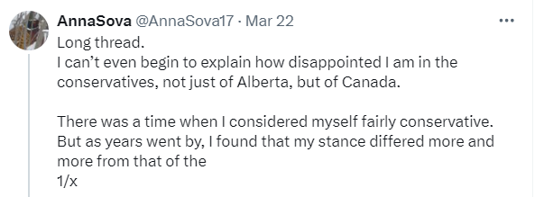 This one does for me. It’s a Twitter thread (X) written by “AnnaSova” who is from a small community in Alberta. I don’t know her real name or the name of her town because she has been “physically threatened in my small community for not supporting conservatives” but I got her permission to post it here in its entirety.