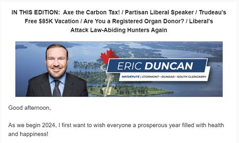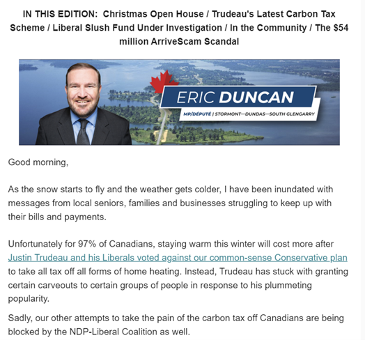In the December email newsletter of just over 500 words (not including the Christmas office info), Eric Duncan refers negatively to the Liberals 14 times and Trudeau 6 times. It also includes a link to a video of Eric talking about Trudeau entitled “ Angry about Trudeau not giving all Canadians an equal break on carbon taxes?”
