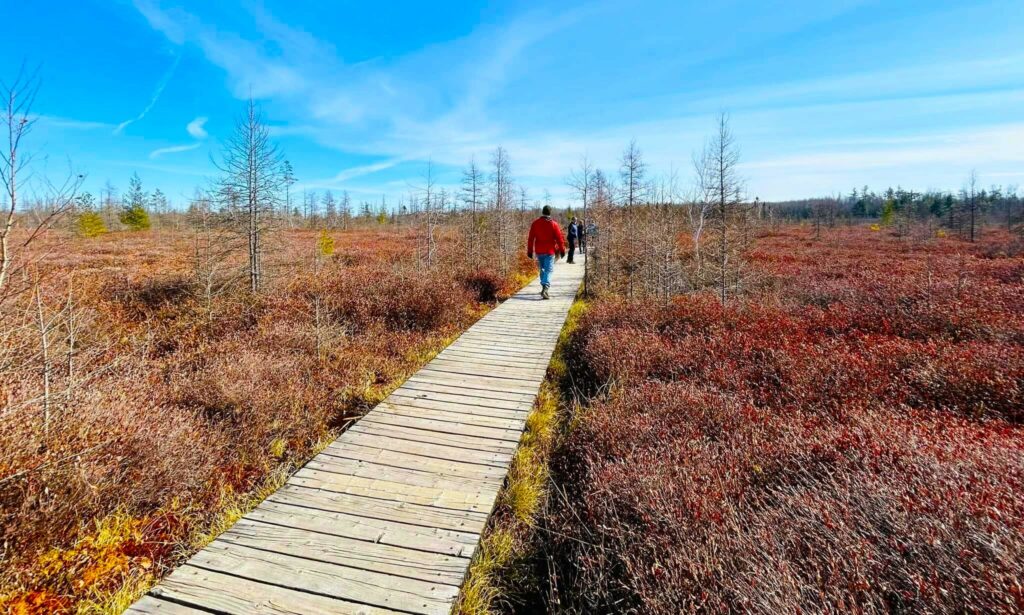 After a picnic lunch, we bid the now not-so-white puppy and his master goodbye as dogs are not permitted on the trail around the bog. I’ve often wondered why this bog is called “Mer Bleue,” which translates to “blue sea” as its only body of water would be more likely described as a pond. The mystery is solved by an interpretive sign explaining that it got its name from early French settlers who noticed that in the early morning when the sun lit the mist, the bog appeared blue thus giving the illusion of being a sea. his trail is almost entirely composed of boardwalks, and it is not hard to see why. The landscape is very fragile, and signs warn us to stay on the trail. The slow-growing bog plants can take decades to grow and stray footsteps can cause much damage. Walking in a peat bog can be just as hazardous to humans. Peat moss, especially when waterlogged, can be very unstable and a misplaced foot could get sucked in and be very difficult to remove. Heaven forbids that one of us should become the next Bog Monster! The landscape is very unusual, with few trees, allowing us to see the horizon’s expanse. I am thankful it is not overly cold today because an open bog offers little protection from the wind. The low vegetation with its reddish hue is interrupted by the occasional pop of stunted black spruces or needle-less tamaracks. I can almost imagine myself seated on one of the wooden benches waiting patiently for a moose to show up, but I would have neither the perseverance nor the courage for a close encounter. In any event, it would be unlikely for one to appear at this time of the year when the bog is at its wettest. Even they are not immune to the suction of the bog.