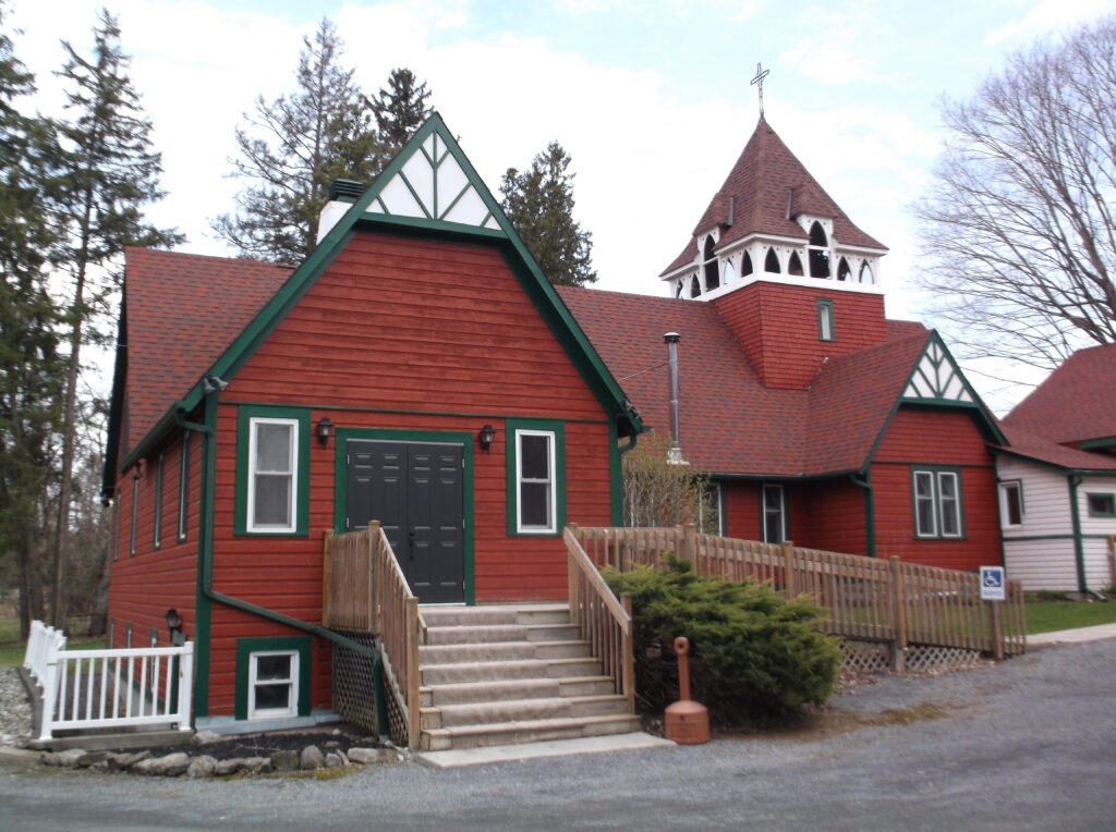 Turn south on CR 34 and back over Highway 401, turn east at Rob McIntosh’s shopping emporium, onto the S. Service Road to Glengarry Park. Here, nestled amongst the trees, you will find St, John the Evangelist Church, which is to my mind the finest and most complete example of late 19th century “arts and crafts” architecture in E. Ontario. The church and parish hall were built to the memory of former Glengarry M.P. and business man John McLennan by his family.