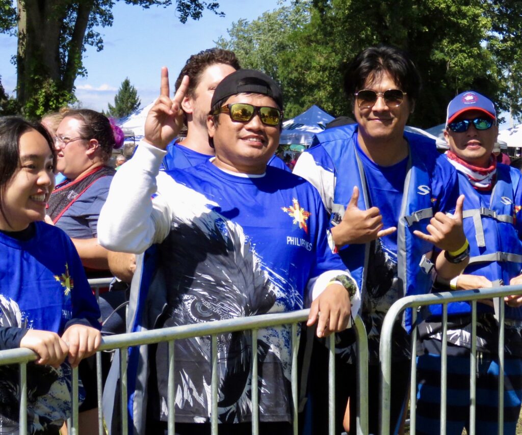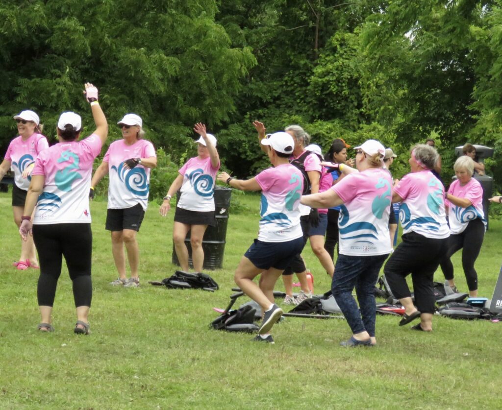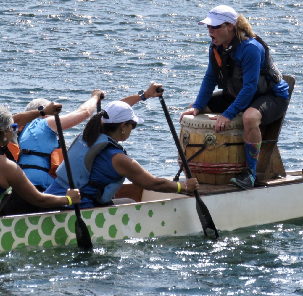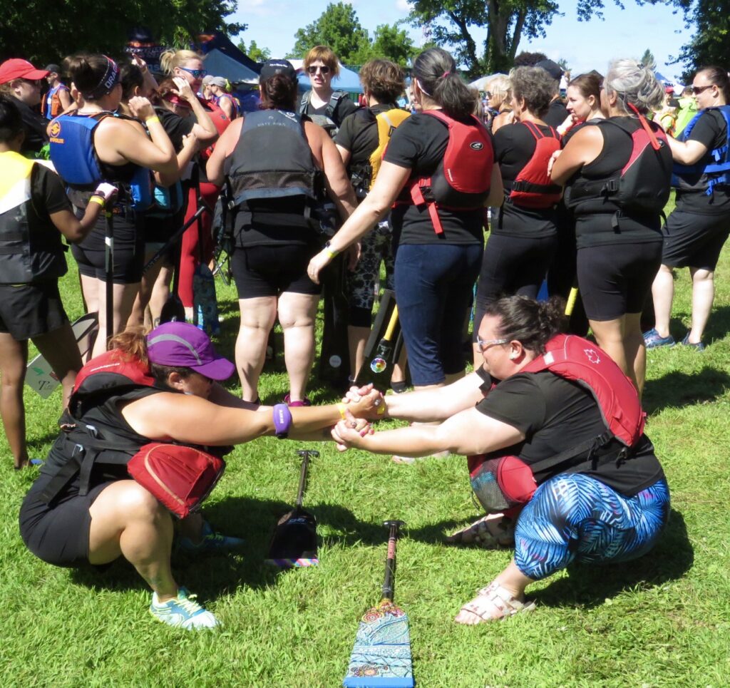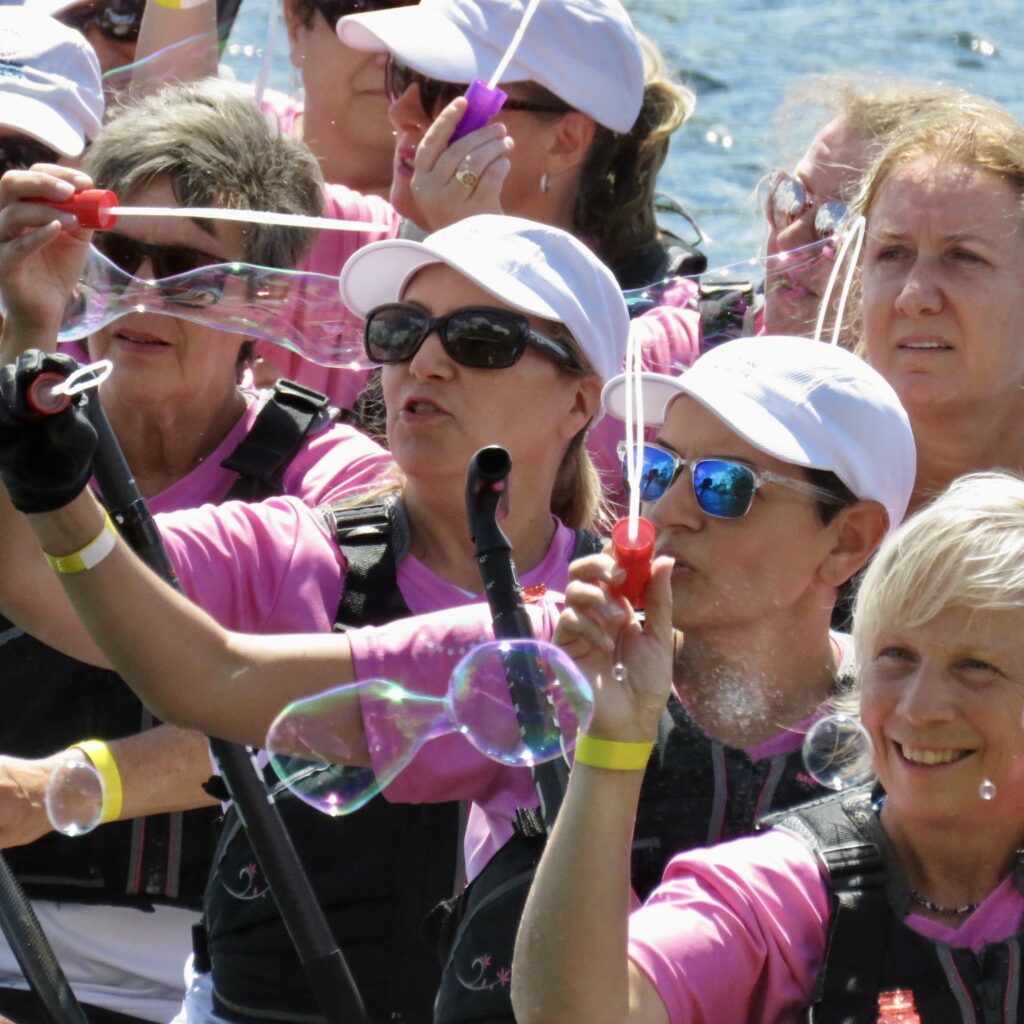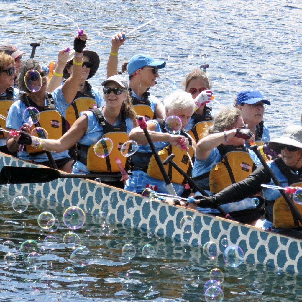 The afternoon heat started with three teams composed of cancer survivors:  Dragon Flies Breast Cancer Survivor Group from Peterborough, Busting Out Ottawa, and West Island Dragons from Montreal. A special ceremony followed with the three teams blowing soap bubbles as Syd Gardner sang accompanied by his guitar.
