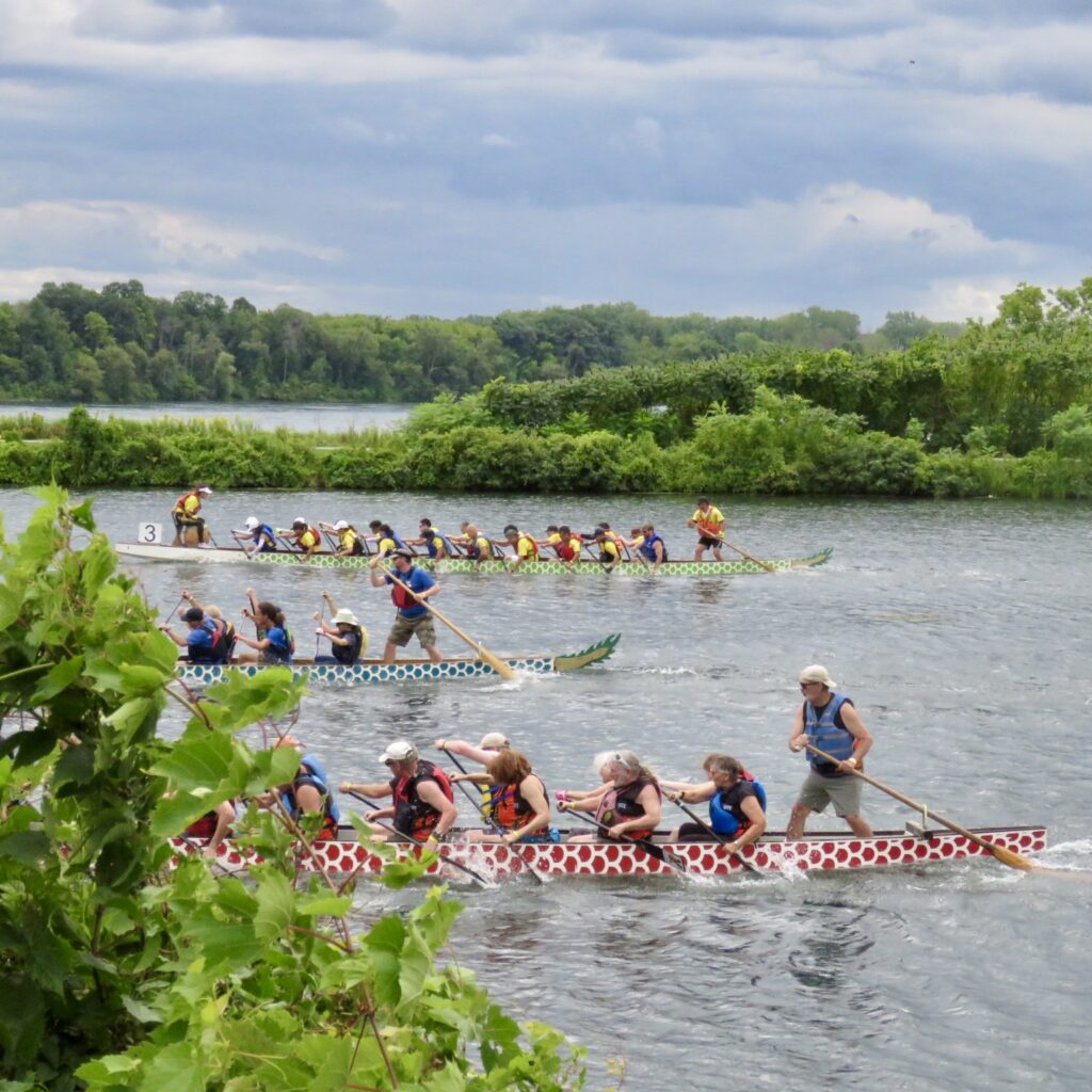Friday’s deluge did not deter the dragons from populating the Cornwall Canal.  On Saturday, August 10, the 12th Cornwall Waterfest Dragon Boat Races were held with 23 teams from Cornwall, Ottawa, Montreal, and Peterborough.  The energy was palpable as teams competed in heats of two or three boats.  Amid the action, local food and craft vendors sold their wares while DJ Shellshock’s music energized the crowds.