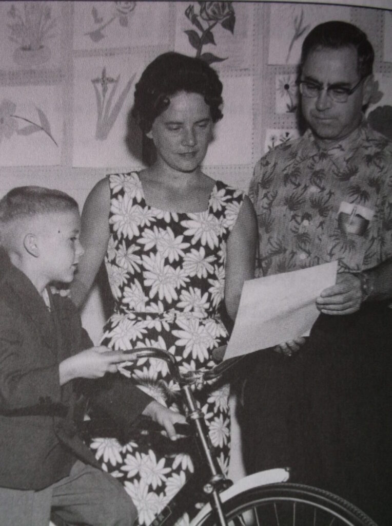 he winner of CFML’s Art Contest, receiving his prize of a new bicycle from broadcaster Madelaine Germain, and donor Jock Dalbec of Dalbec Sporting Goods, Montreal Road.