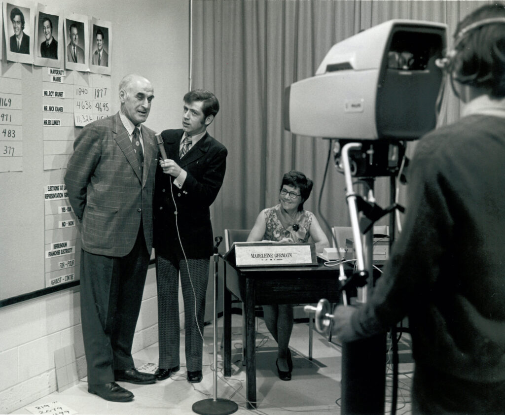 Bernard Bertram modernized Cornwall’s cable tv delivery, and launched Cable 11’s community programming with the coverage of the Municipal election on December 6, 1971. Here Mayor Kaneb on the left, is being interviewed by Clement Charrette, with CFML/Cable II, news broadcaster Madelaine Germain at the desk. Kaneb lost the election to newcomer Ed Lumley. (Photo courtesy, YourTV Cornwall/COGECO.)