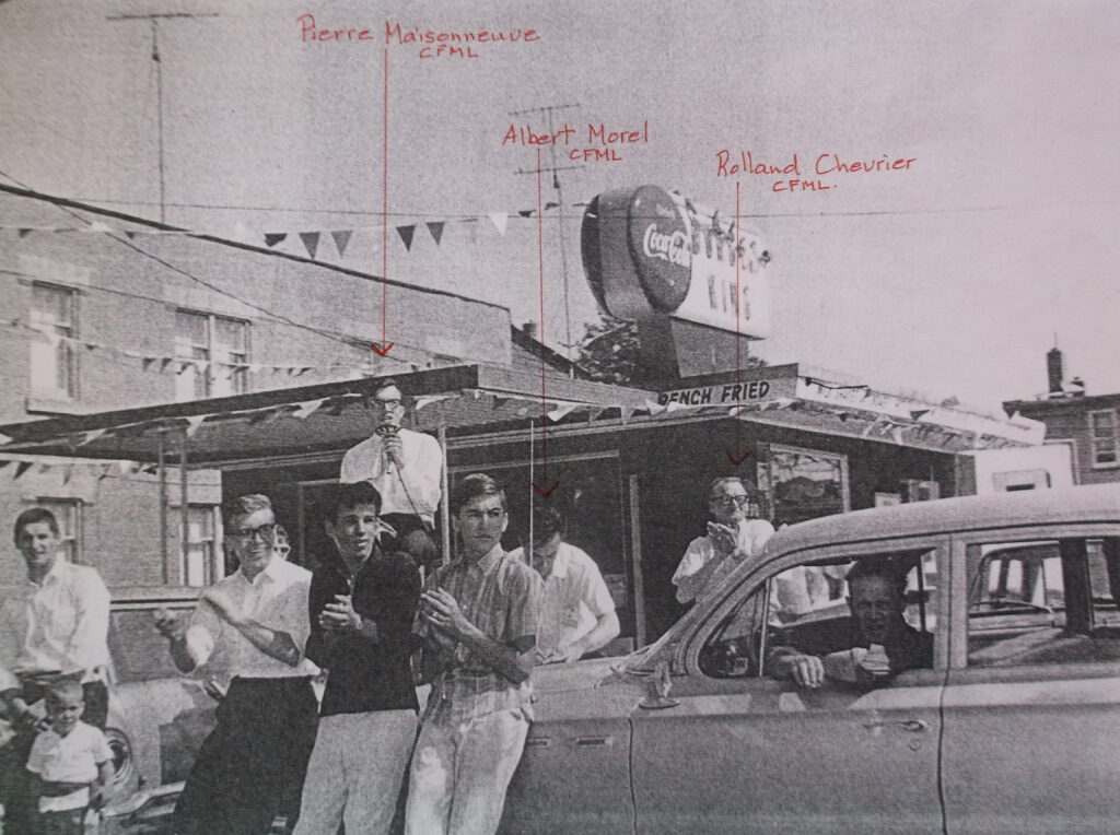 An early 1960s French Week parade in front of Montreal Road’s Burger King (now the site of Roy’s Studio.) CFML enthusiastically supported French Week. This photograph shows radio announcer Pierre Maisonneuve, standing in the rear with a microphone; Programme Director Albert Morel is taking notes on the hood of the car and broadcaster Roland Chevrier is clapping behind the car.
