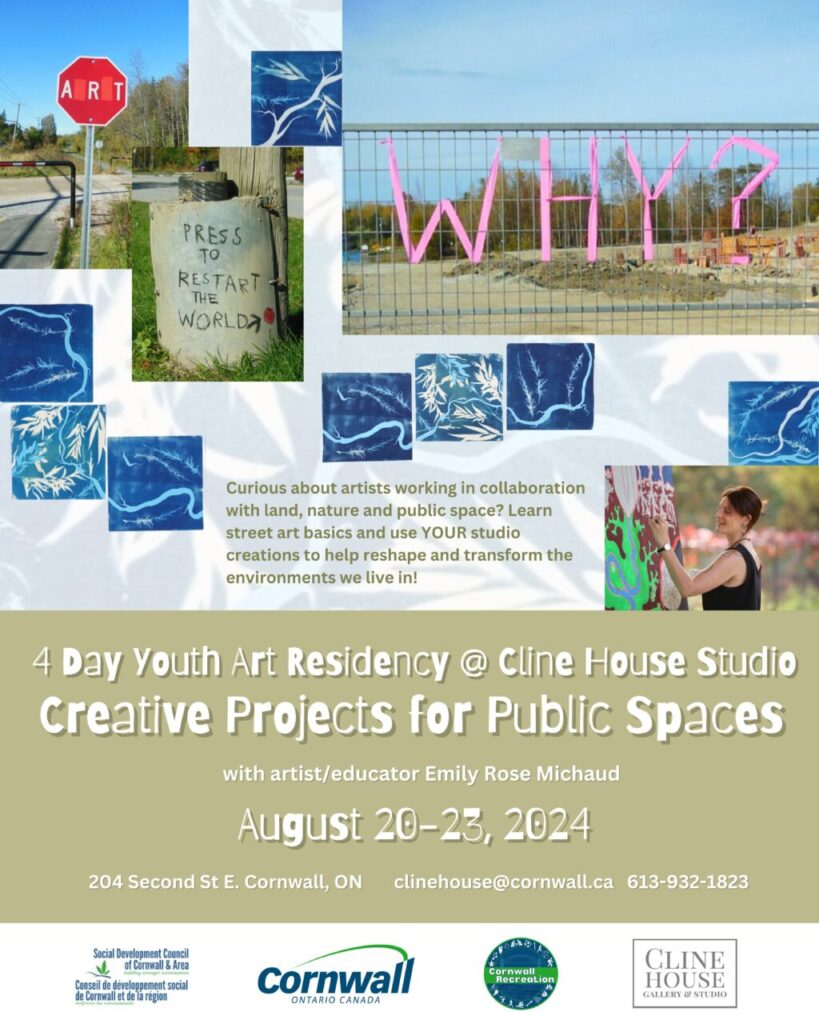 Cornwall, ON- August 20, 2024 – The Cline House Gallery is thrilled to announce a special four-day art program from August 20- 23, 2024, with renowned interdisciplinary artist Emily Rose Michaud of Gatineau, QC. The program titled, “Introduction to Land Art and Projects for Public Spaces” invites local youth to explore the dynamic intersection between art, nature and public space. This innovative program is made possible through the City of Cornwall’s “Building Safer Communities” fund, awarded by the Public Safety of Canada and managed by the Social Development Council of Cornwall and Area.