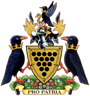 “The supporters are black ravens, recalling the Cornish Choughs used by the Duchy of Cornwall, they are crowned with Coronets in the form of fleurs de lys” recalling the settlers’ loyalty to the Crown.