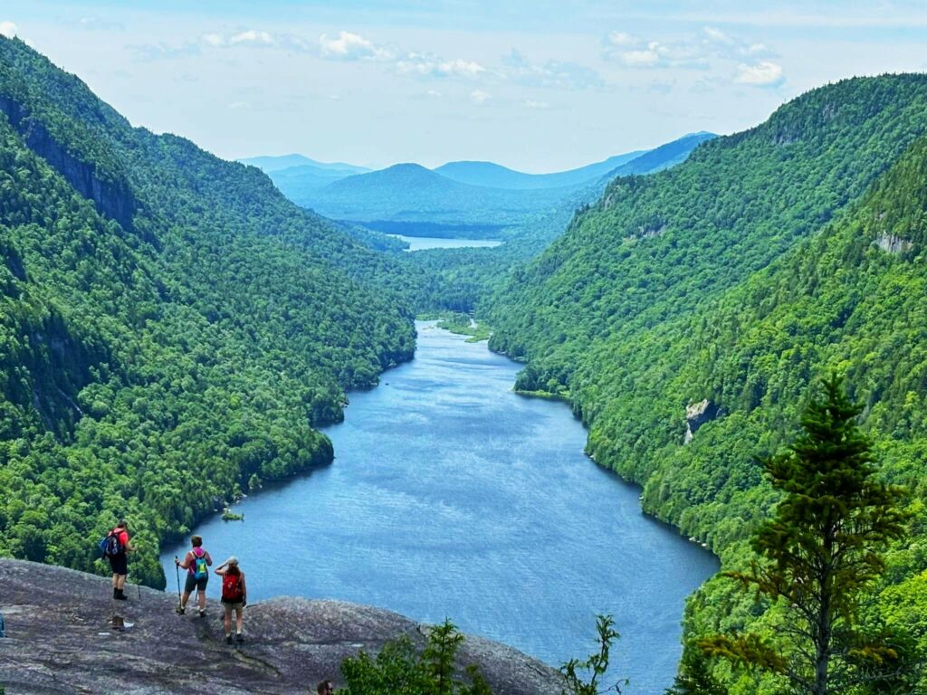 It is not until we reach the Gill Brook trailhead that the real hiking begins. Roots and rock hazards are everywhere, and we must tread with care, but the trail is aesthetically delightful, zigzagging along the brook to the soothing sound of running water. It is worth maneuvering through slippery moss-covered stones and mud to admire all the waterfalls along our path. Due to steepness, we sometimes need to climb stairs or wooden ladders to attain the next level. Although the trail is picturesque, I am languishing in the heat and eager to reach the summit. The closer we get to it, the rockier the terrain becomes, but my spirits are high from the certainty of what awaits at the top. Of this, my memory could not be clearer: The massive rockface looking down at the Ausable River in the valley below and the mountain peaks towering above us. It is a stunning location for dining and resting our weary feet. It is very windy here and we must hang on to our hats for fear of losing them in the abyss. But after our exertion in the heat, the airflow is a blessing. We are in no hurry to head back down the trail.