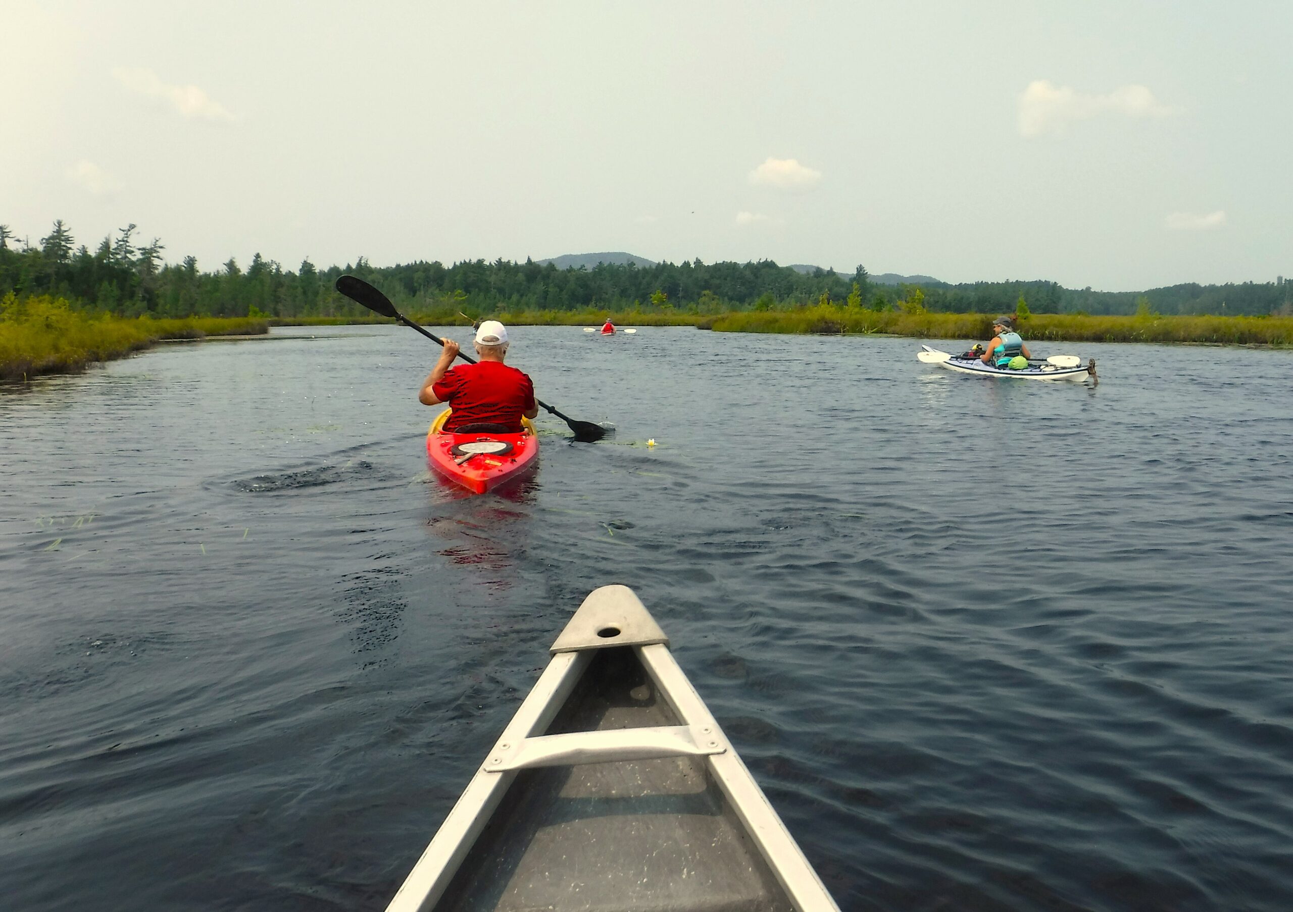 Our Day Two paddle takes us through marshy channels linking several ponds. It is fun to zigzag through the narrow waterway and wonder what lies beyond the next curve. Although we don’t see any loons, we are visited by several American Black Ducks. It is hot out today and we are eager to jump into the ice-cold pond to enjoy a swim.