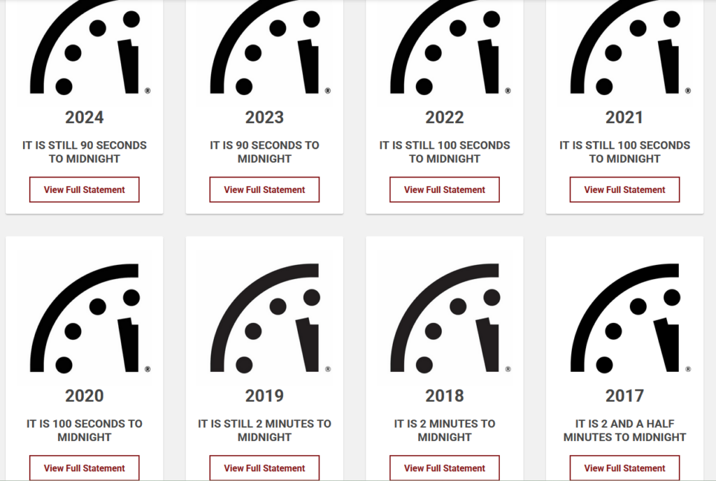 Today, we heard the announcement that the Doomsday Clock is now at 89 seconds to midnight. Yes, it’s just once second less than last year’s 90, but it the hand is constantly moving, and NOT in the right direction. Tick tock.