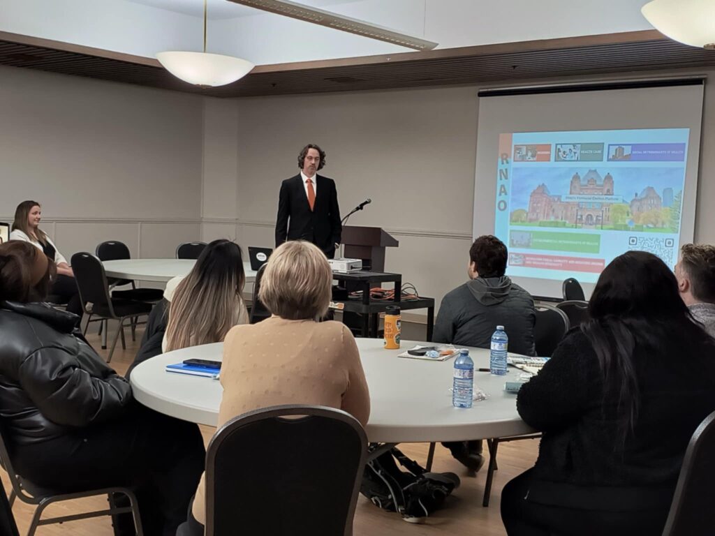 NDP candidate Jeremy Rose participated in the discussion, engaging with students on key issues affecting Ontario’s healthcare system. One major concern raised was the increasing burden on nurses due to staff shortages, leading to burnout and overworked conditions. The students wanted to know: How can nurses be better supported so they can provide quality patient care without facing exhaustion and unsafe workloads?