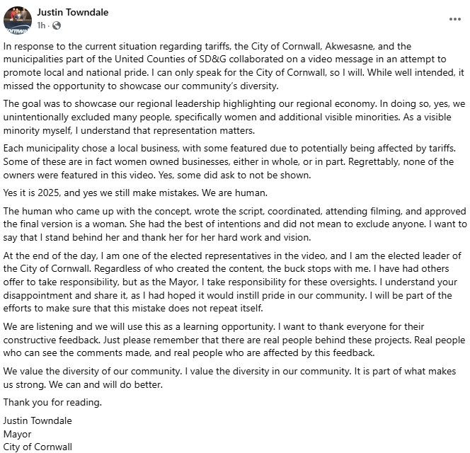 6:00pm update: Cornwall Mayor posted the following statement