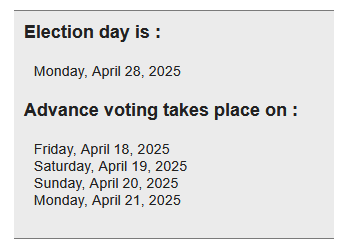 It is crucial for citizens to participate in democracy by voting in the upcoming election on April 28th. You can also vote in advance from April 18th to the 21st. Make sure your voice is heard—exercise your right to vote and help shape the future of our country. Visit https://www.elections.ca to find out voter information.