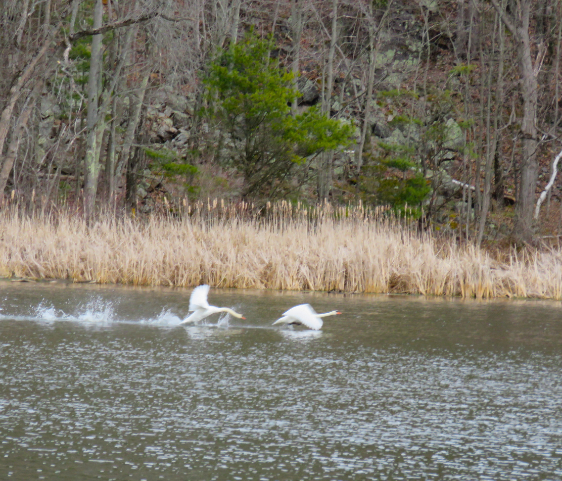 We take the trail to the lookout. From that nosebleed section, I expect to see swans in the bay because I have seen them there on past occasions, but I am not prepared for the massive flock of Mute Swans dotting the water below me. This ensemble creates the perfect backdrop for the main performance, which is about to start. The protagonists in this play are a duo of Ospreys. We watch them soaring in opposite directions, circling above the bay. Suddenly, one swoops down, almost skimming the water’s surface, and then quickly regains altitude. Perhaps it is dissatisfied with its lunch prospects. The second one, deciding to test its luck, dives diagonally, twisting midair to plunge into the water talons first. Within seconds, it emerges, flapping its wings while grasping a doomed fish between its talons. We watch in awe as it flies off with its prize. A playwright couldn’t dream up a better climax for the second act.