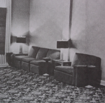 Inside the outer lobby was decorated in beige, peach and lime green with modernistic furniture and a water fountain.Simplicity was the keynote “giving the theatre an appearance which is at once striking and eye-pleasing.There is a decided absence of frills or dressiness” except for the small islands of concentrated decoration.