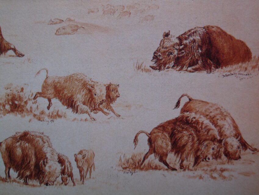 (photo 1 – and caption.) Early 19th century depictions of prairie buffalo. Two hundred years ago it is estimated that between 30 and 60 million buffalo inhabited North America’s prairies. Over hunting for food and “sport” nearly led to their extinction and today it is estimated that there are 2,200 plains buffalo and 10,000 wood buffalo. (Courtesy, Library Archives Canada, C1055.)