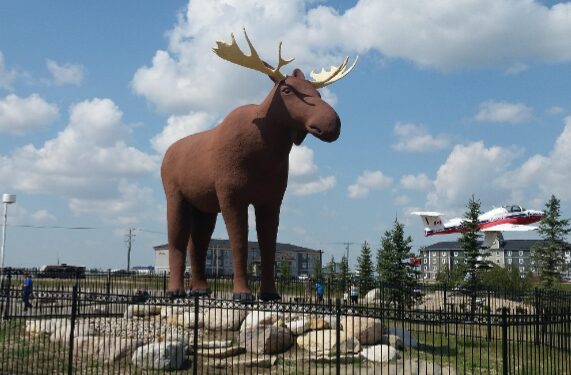 Mac the Moose is a steel and concrete sculpture in Moose Jaw, Saskatchewan, on the grounds of Moose Jaw’s visitors’ centre. In January 2019, two Canadian comedians urged Moose Jaw residents to add 31 cm (12 in) to Mac’s height (likely by extending his antlers or giving him a helmet), so that the moose statue would once again win the title of the world’s largest moose.